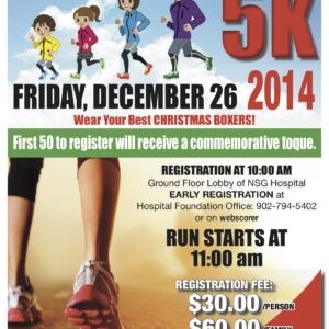 We invite you to join us for our 1st annual Boxing Day 5K on Friday December 26th, 2014. We encourage you to bring your family to run or walk the route together. Registration begins at 10 am on the Ground Floor Lobby of the Northside General Hospital or register early at the Norhside/Harbourview Hospital Foundation Office. Call us at 902-794-5402. The run begins at 11 am and the first 50 people to register will receive a commemorative toque. The registration fee is $30, all proceeds to adolescent mental health & addiction.